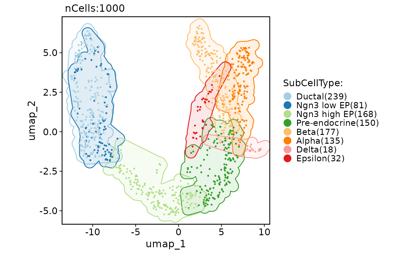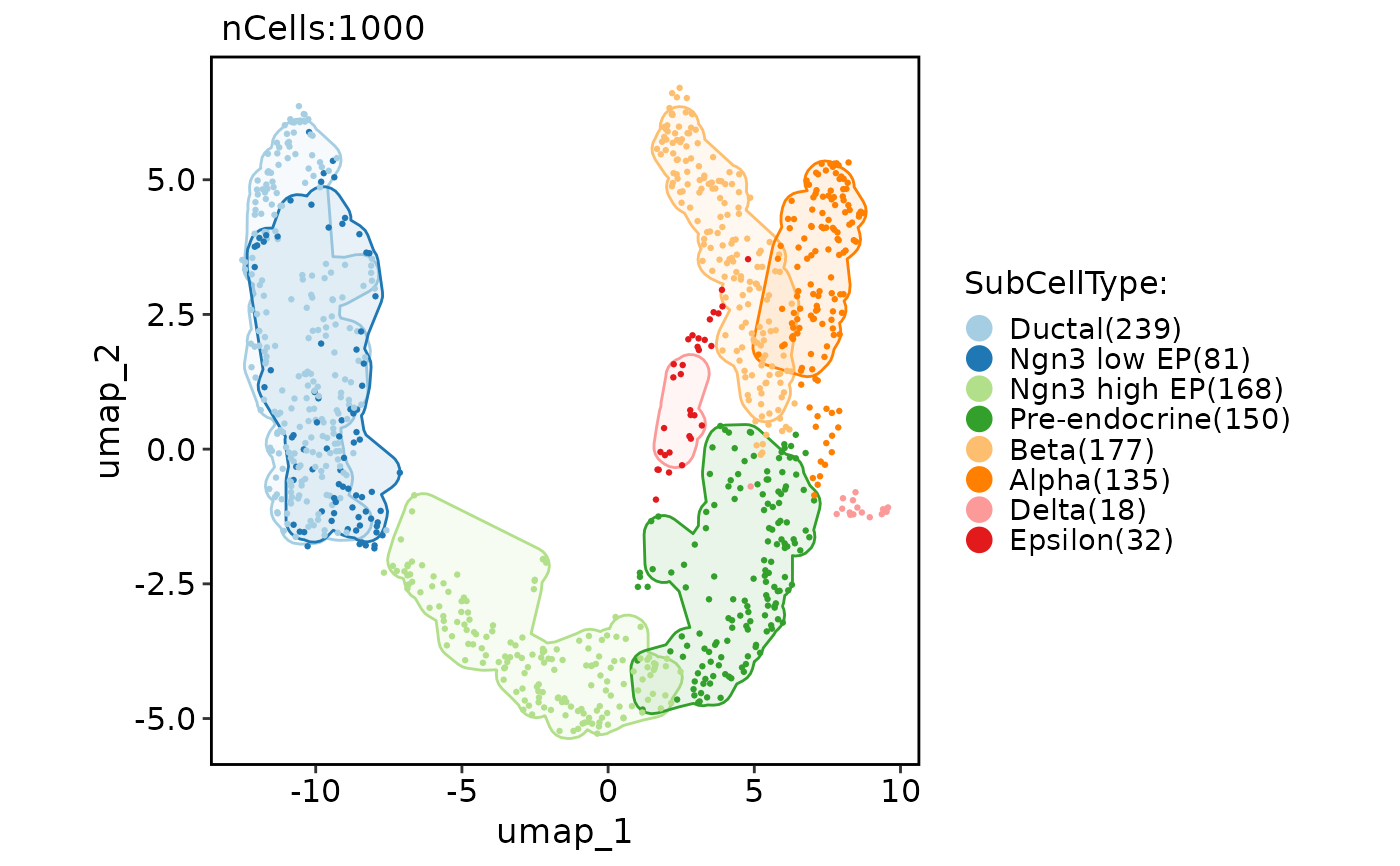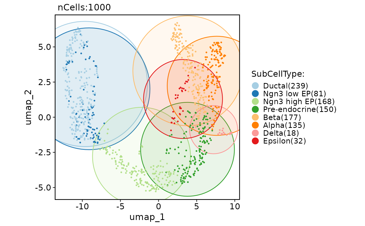 CellDimPlot(pancreas_sub, group.by = "SubCellType", reduction = "UMAP", add_mark = TRUE, mark_type = "circle")