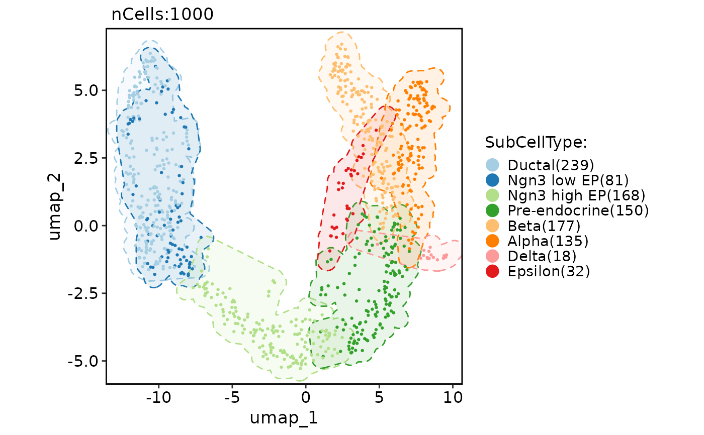 CellDimPlot(pancreas_sub, group.by = "SubCellType", reduction = "UMAP", add_mark = TRUE, mark_linetype = 2)