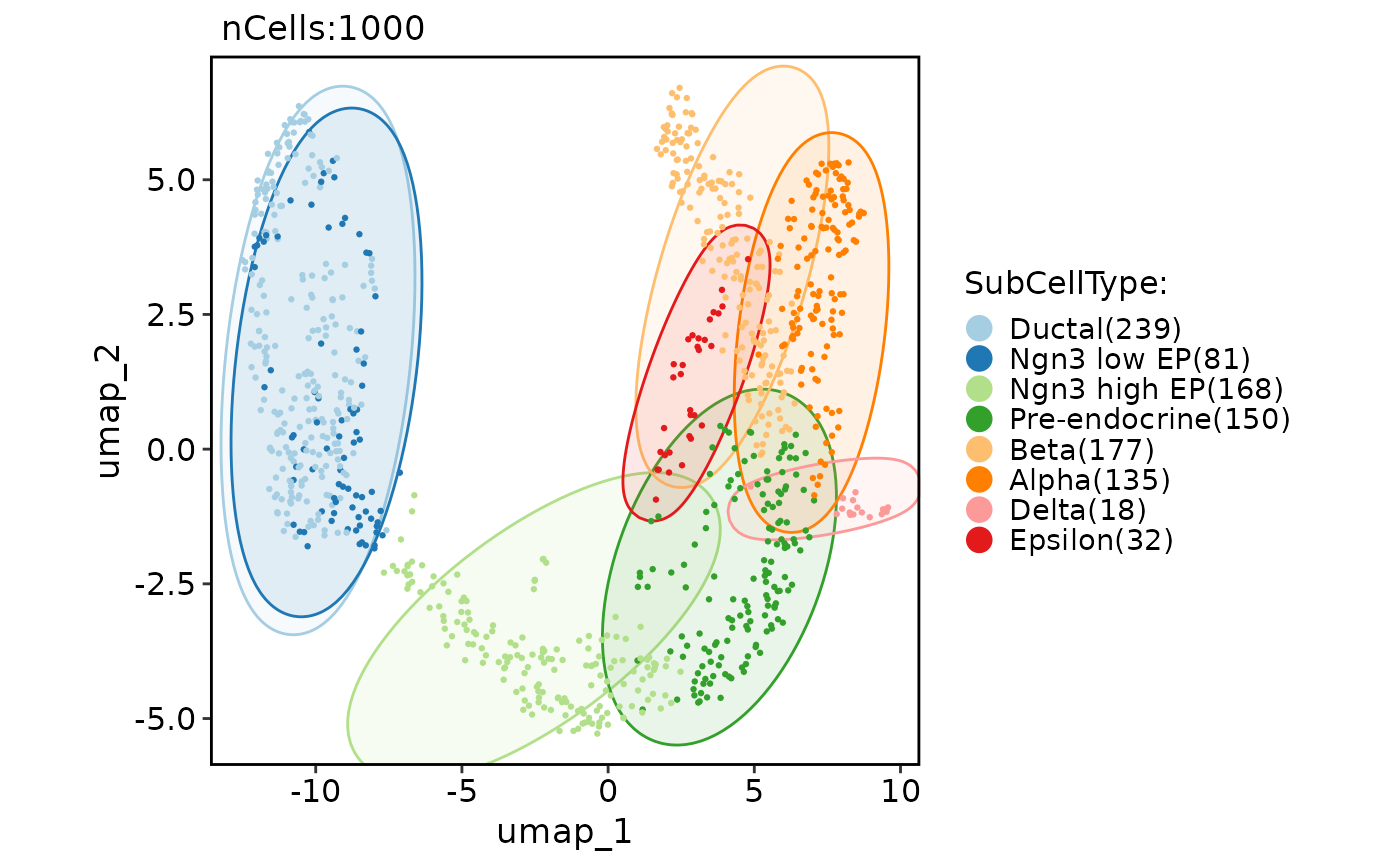 CellDimPlot(pancreas_sub, group.by = "SubCellType", reduction = "UMAP", add_mark = TRUE, mark_type = "ellipse")