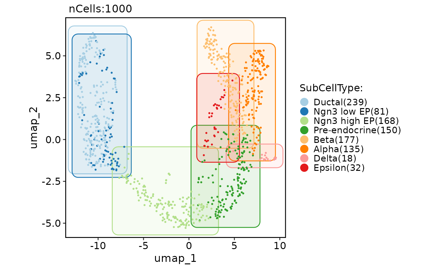 CellDimPlot(pancreas_sub, group.by = "SubCellType", reduction = "UMAP", add_mark = TRUE, mark_type = "rect")
