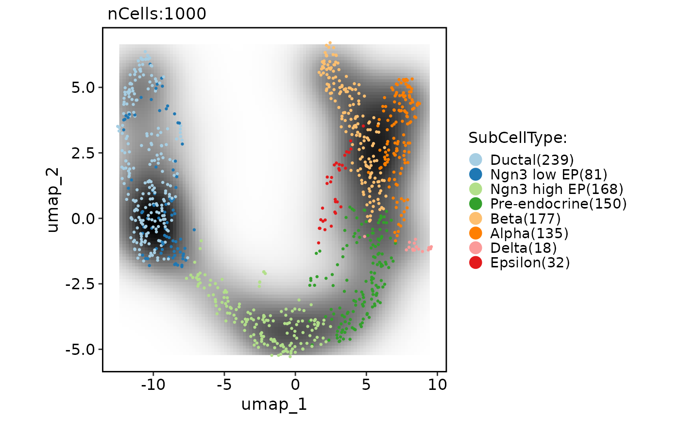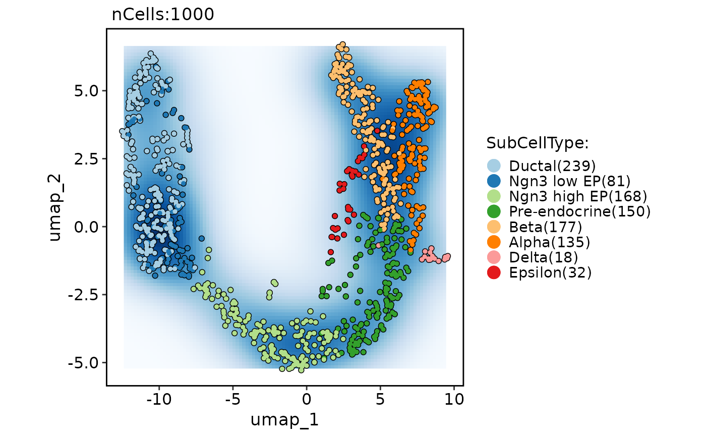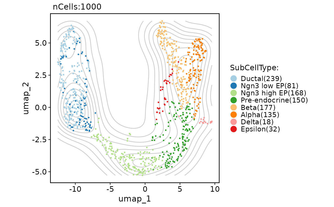 CellDimPlot(pancreas_sub, group.by = "SubCellType", reduction = "UMAP", add_density = TRUE)