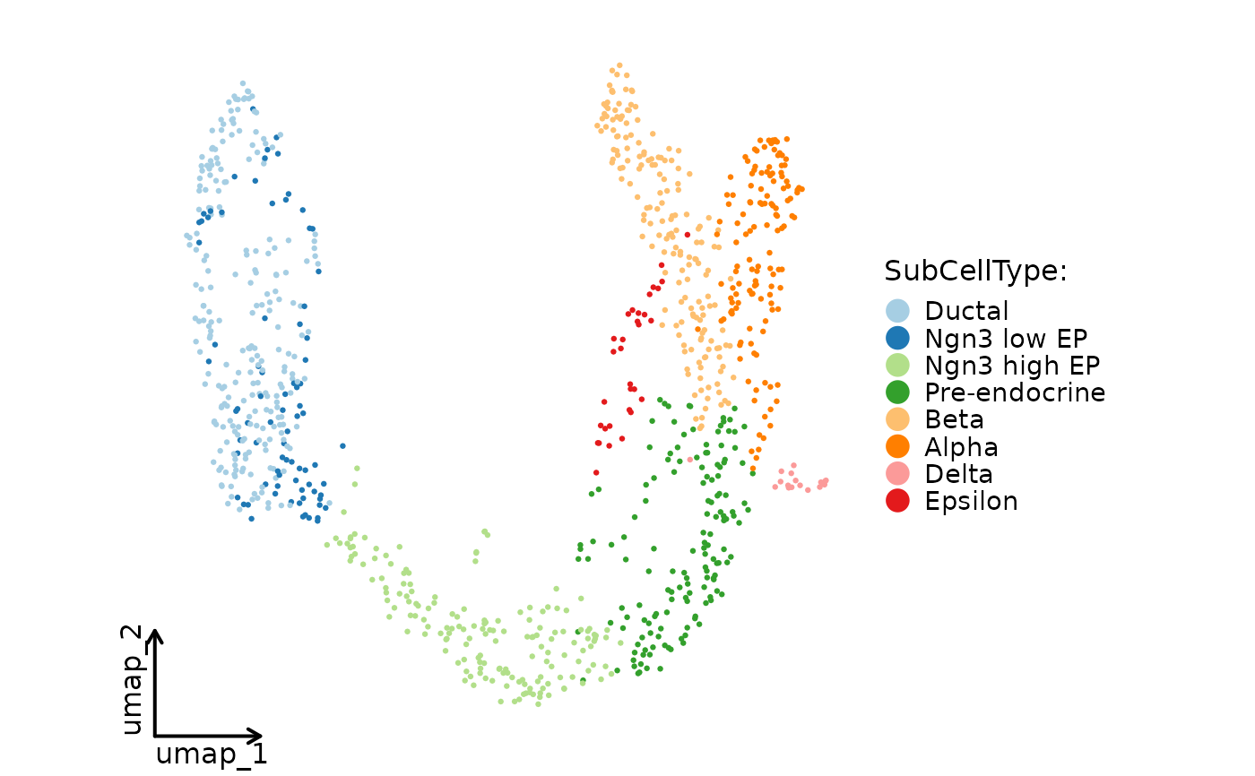 CellDimPlot(pancreas_sub, group.by = "SubCellType", reduction = "UMAP", theme_use = ggplot2::theme_classic, theme_args = list(base_size = 16))