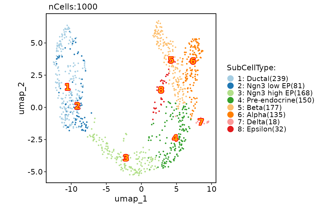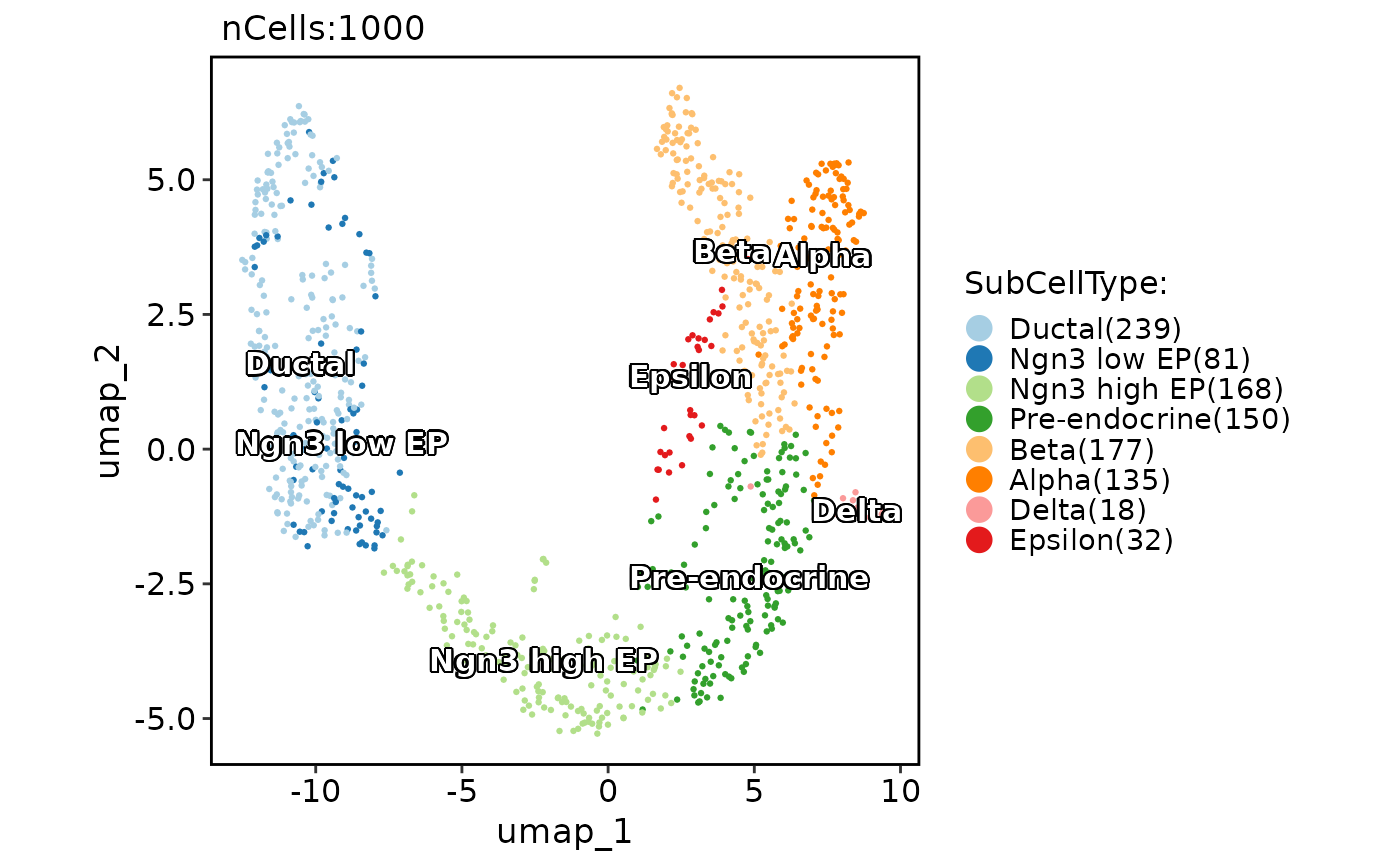 CellDimPlot(pancreas_sub, group.by = "SubCellType", reduction = "UMAP", label = TRUE)