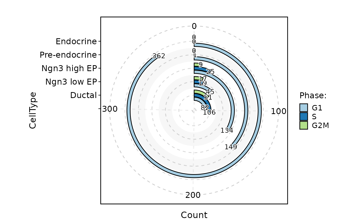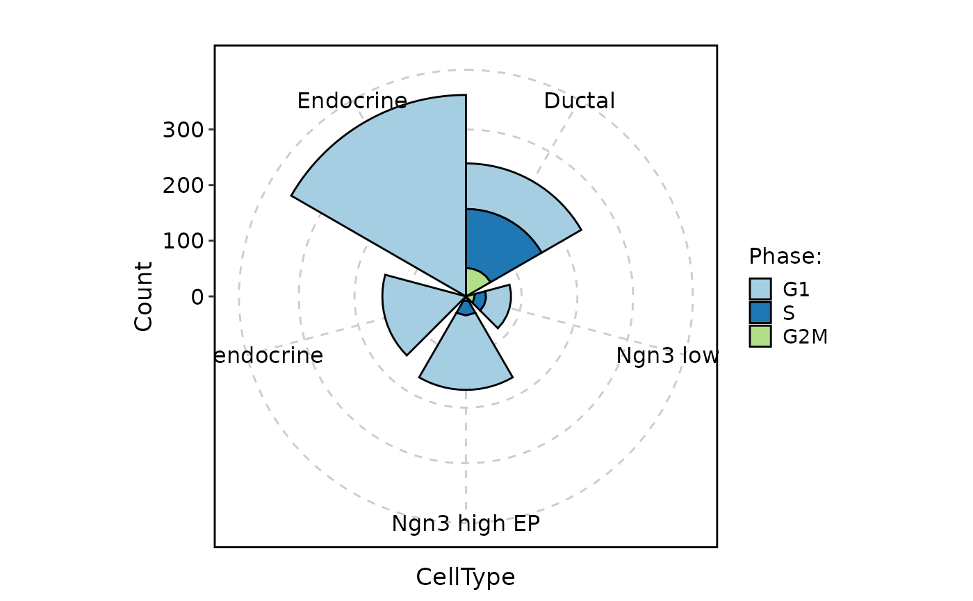 CellStatPlot(pancreas_sub, stat.by = "Phase", group.by = "CellType", plot_type = "rose")