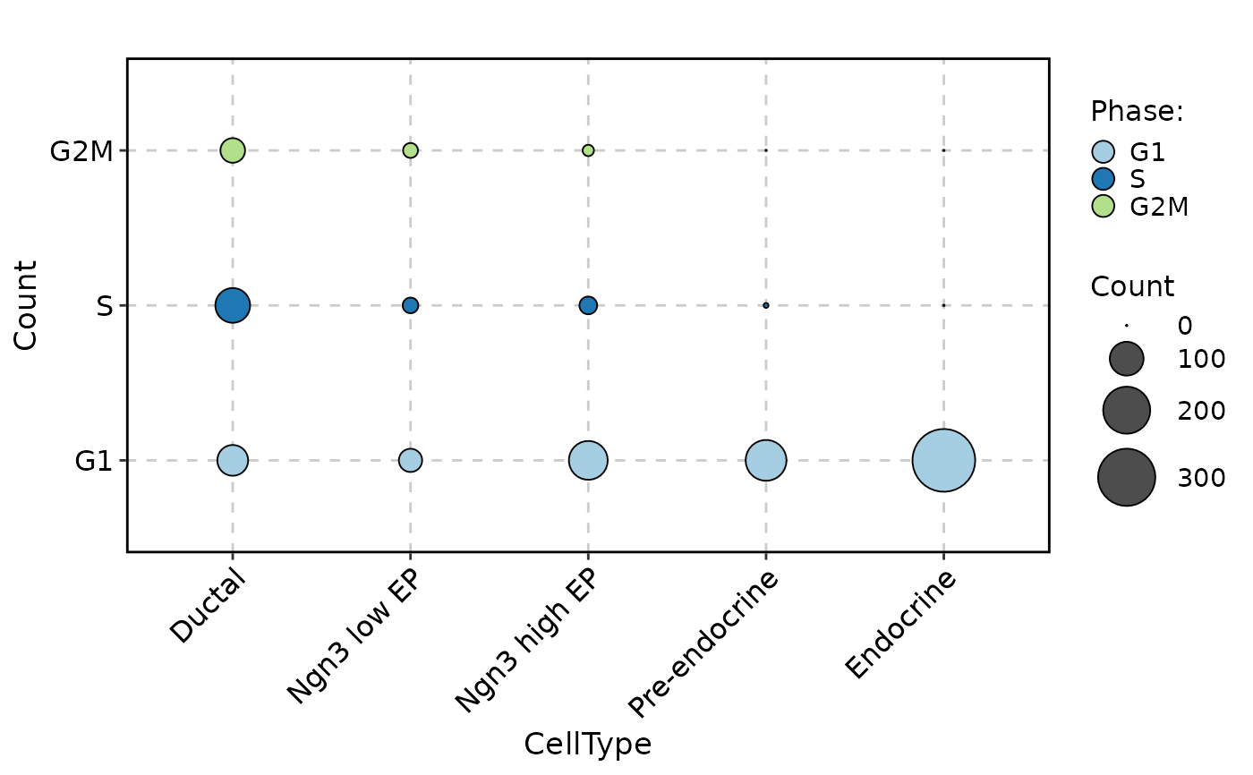 CellStatPlot(pancreas_sub, stat.by = "Phase", group.by = "CellType", stat_type = "count", plot_type = "dot")