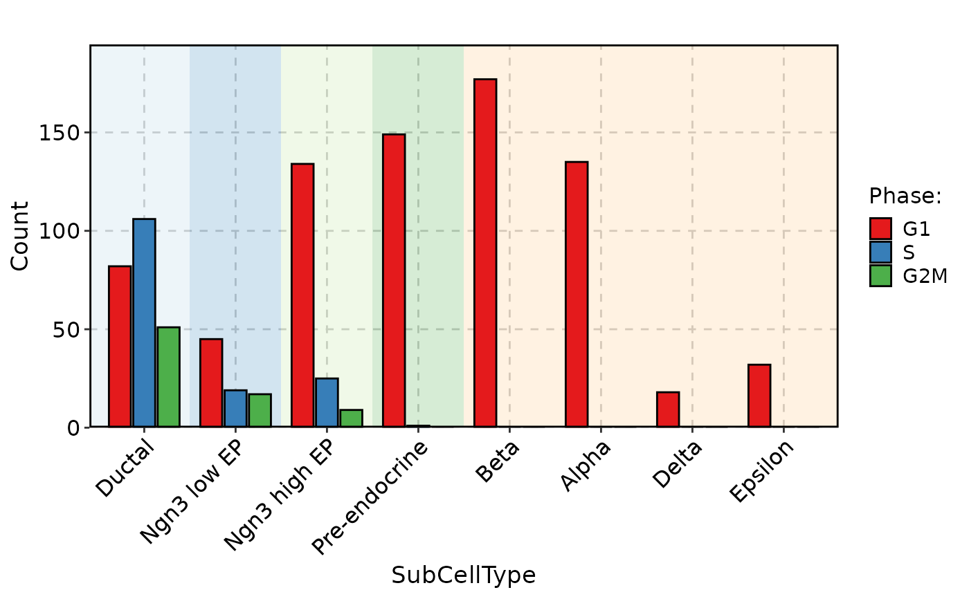 CellStatPlot(pancreas_sub, stat.by = "Phase", group.by = "SubCellType", bg.by = "CellType", palette = "Set1", stat_type = "count", position = "dodge")