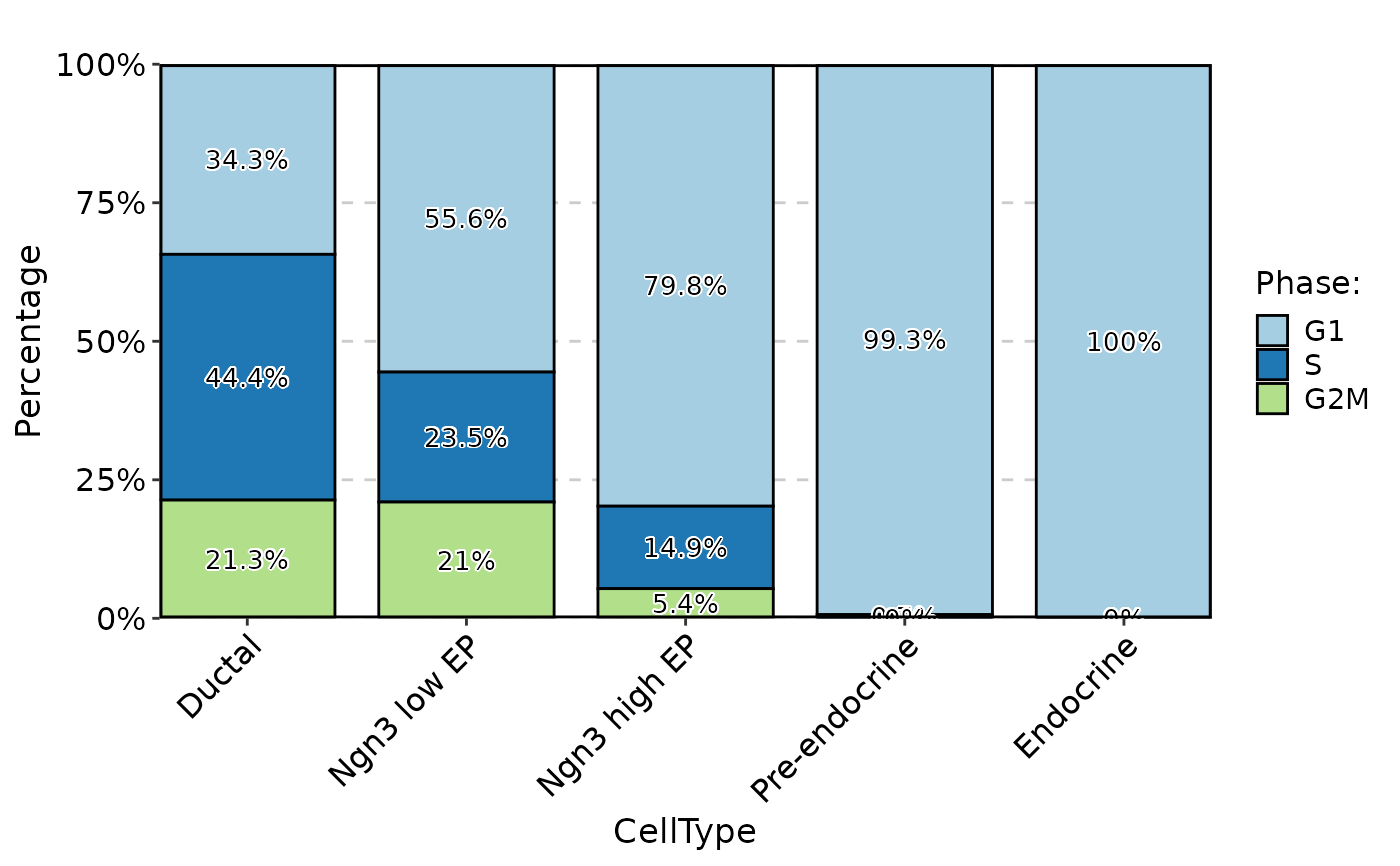 StatPlot(pancreas_sub@meta.data, stat.by = "Phase", group.by = "CellType", plot_type = "bar", label = TRUE)