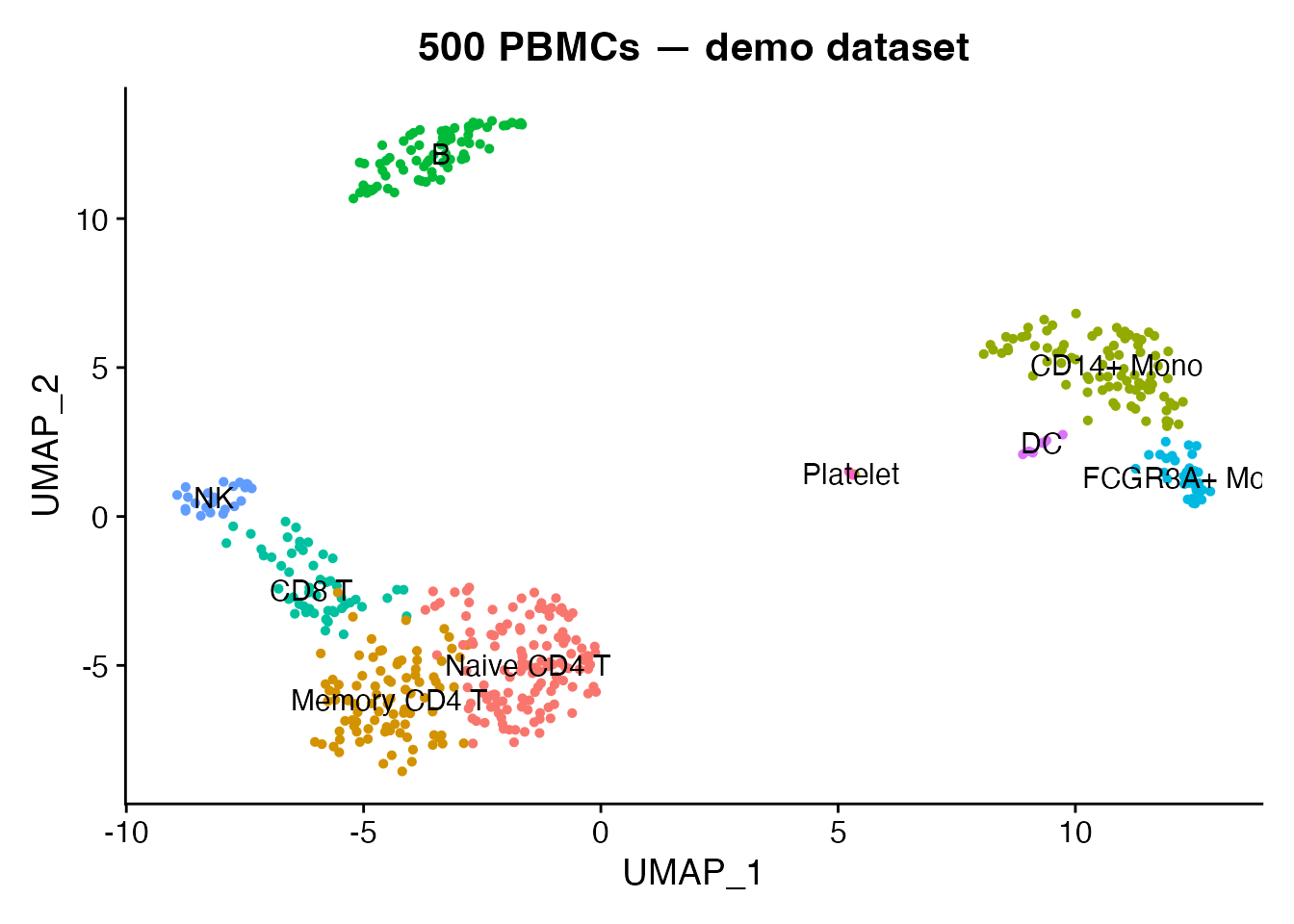 ggtitle("500 PBMCs — demo dataset") + NoLegend()