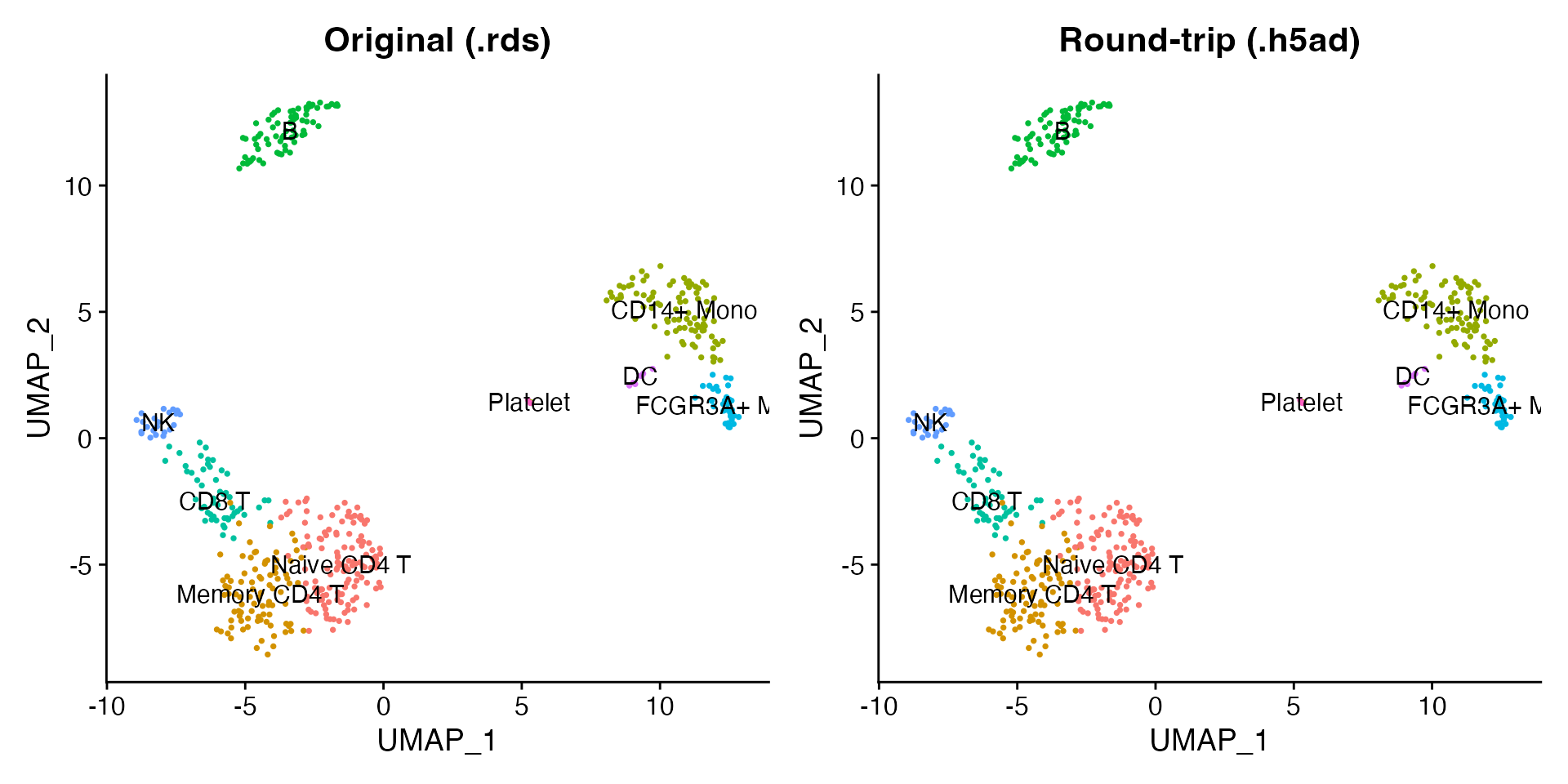 label = TRUE, pt.size = 0.5) + NoLegend() + ggtitle("Round-trip (.h5ad)")
