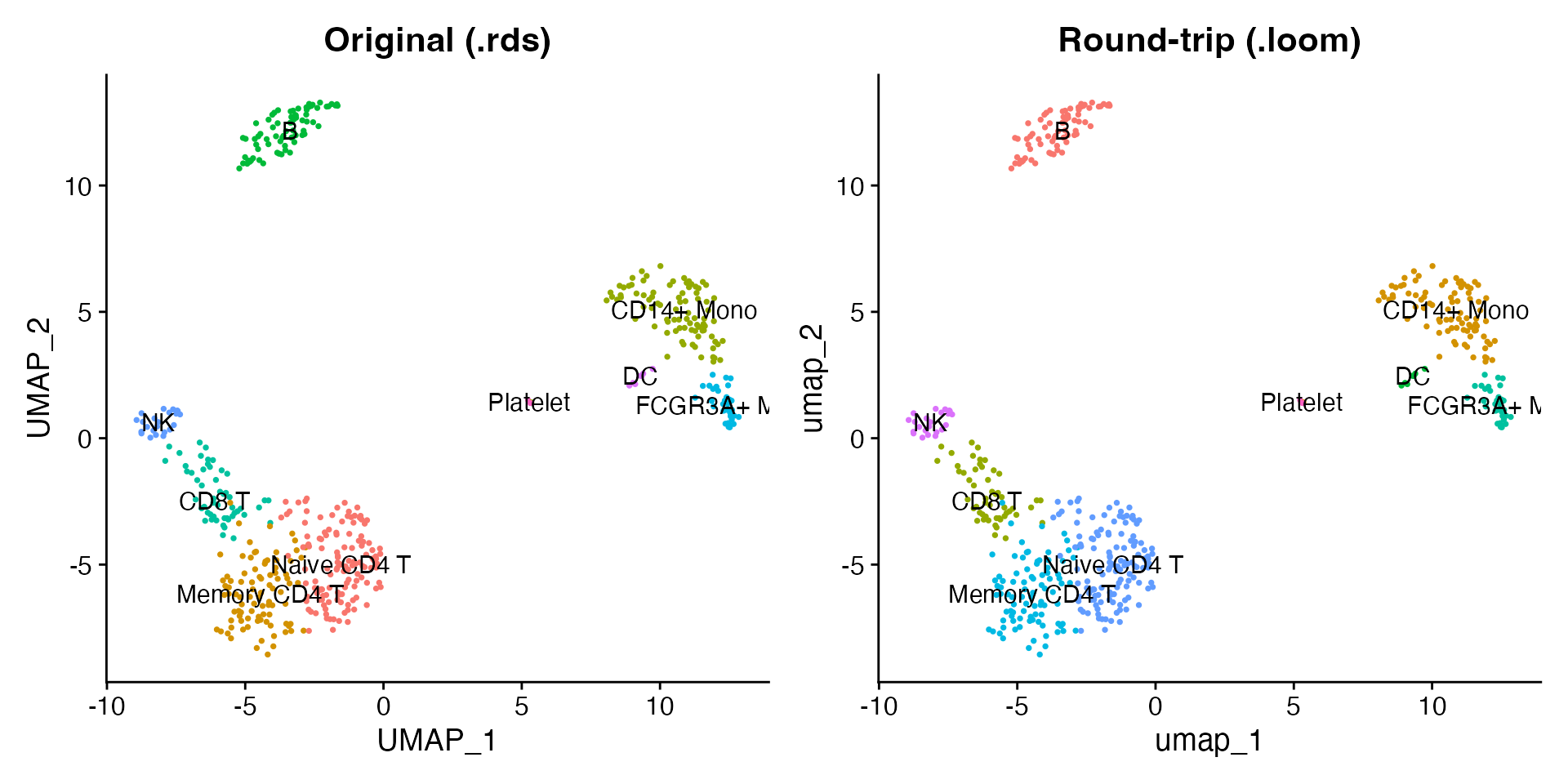 label = TRUE, pt.size = 0.5) + NoLegend() + ggtitle("Round-trip (.loom)")