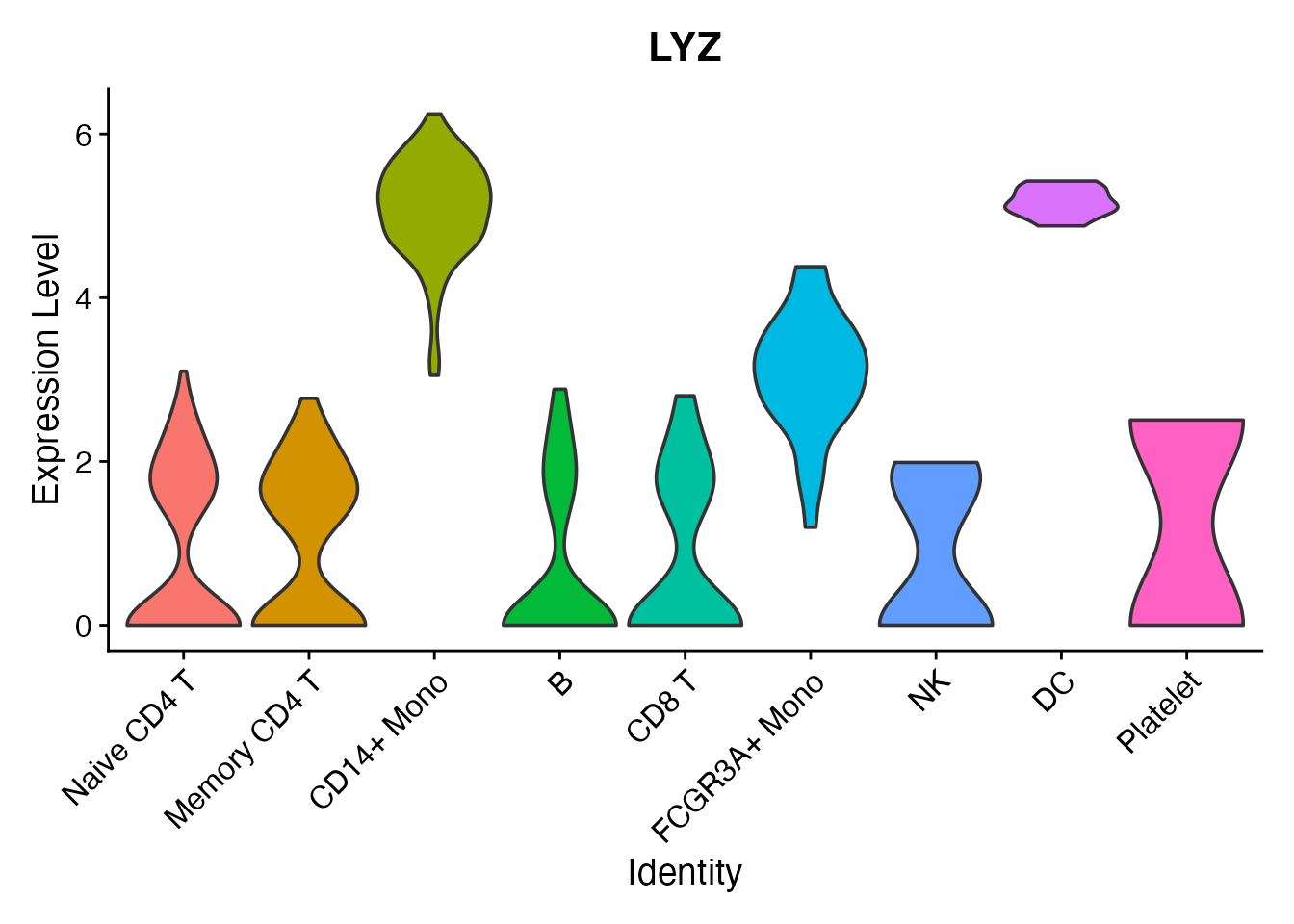 VlnPlot(pbmc, features = "LYZ", group.by = "seurat_annotations", pt.size = 0) +